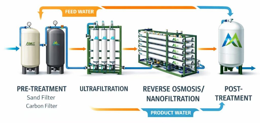 Integrated process flow from feed water to product water, combining pretreatment, membrane separation, and post-treatment.